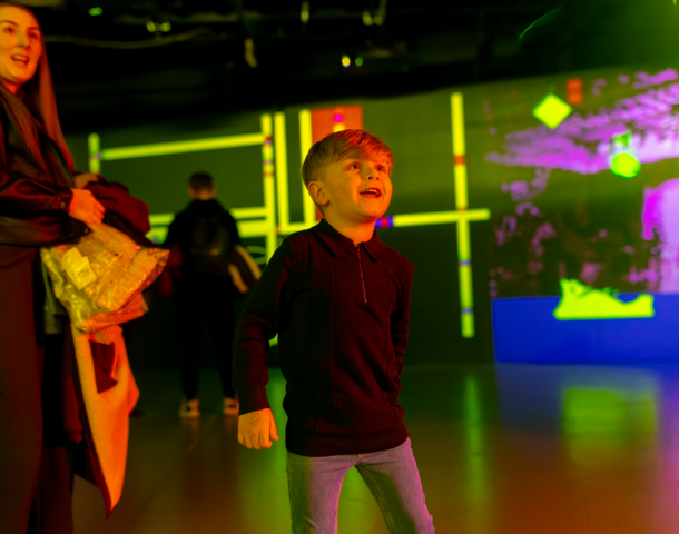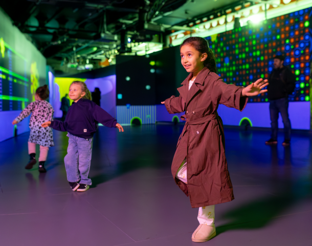 Unlike traditional screen-based experiences, children use their whole bodies to interact with the space. By dancing, jumping, waving or spinning, they can transform the digital environment around them, triggering sounds, unlocking surprises and discovering playful characters.