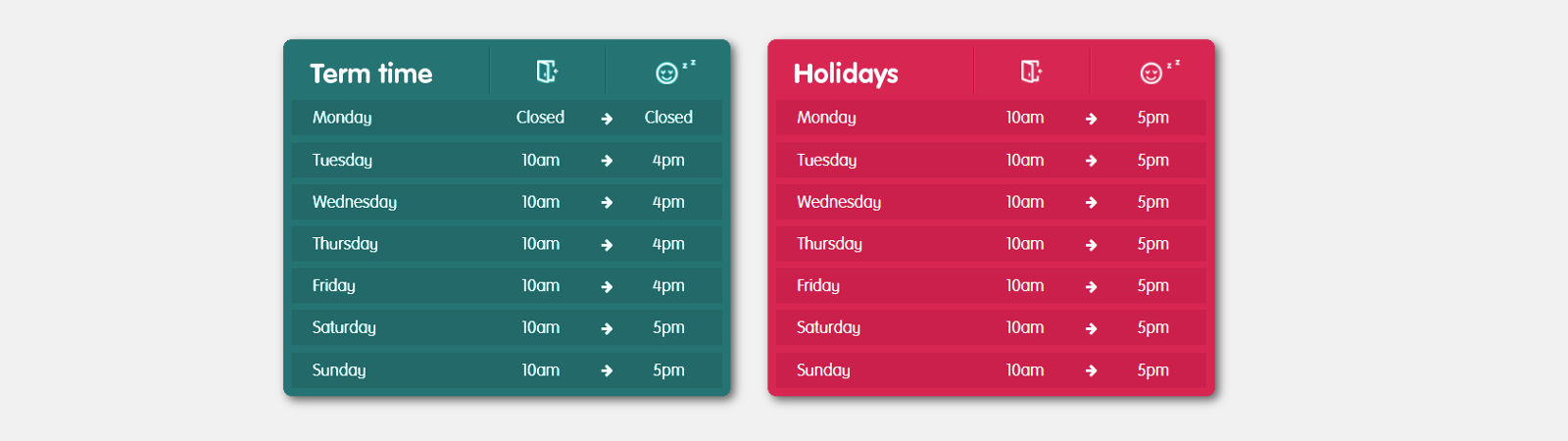 During term-time we’re open from Tuesday to Sunday and closed on Mondays.